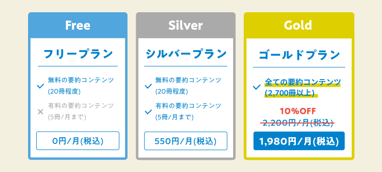 料金プランはゴールド・シルバー・フリーの3種類が用意されているので、自分に最適なプランを選びましょう。